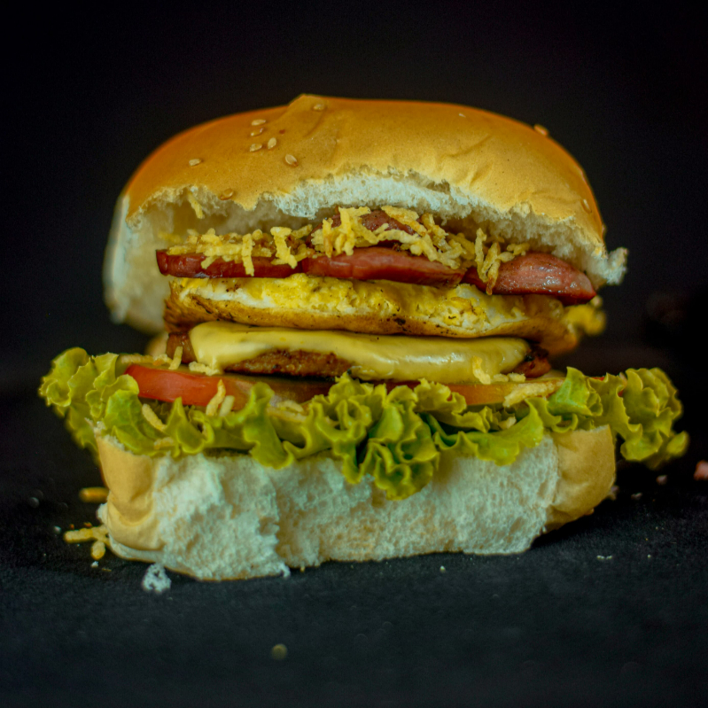 Pão Tradicional, 75g de Carne, Mussarela, Ovo, Bacon, Batata Palha, Tomate, Cebola, Alface.