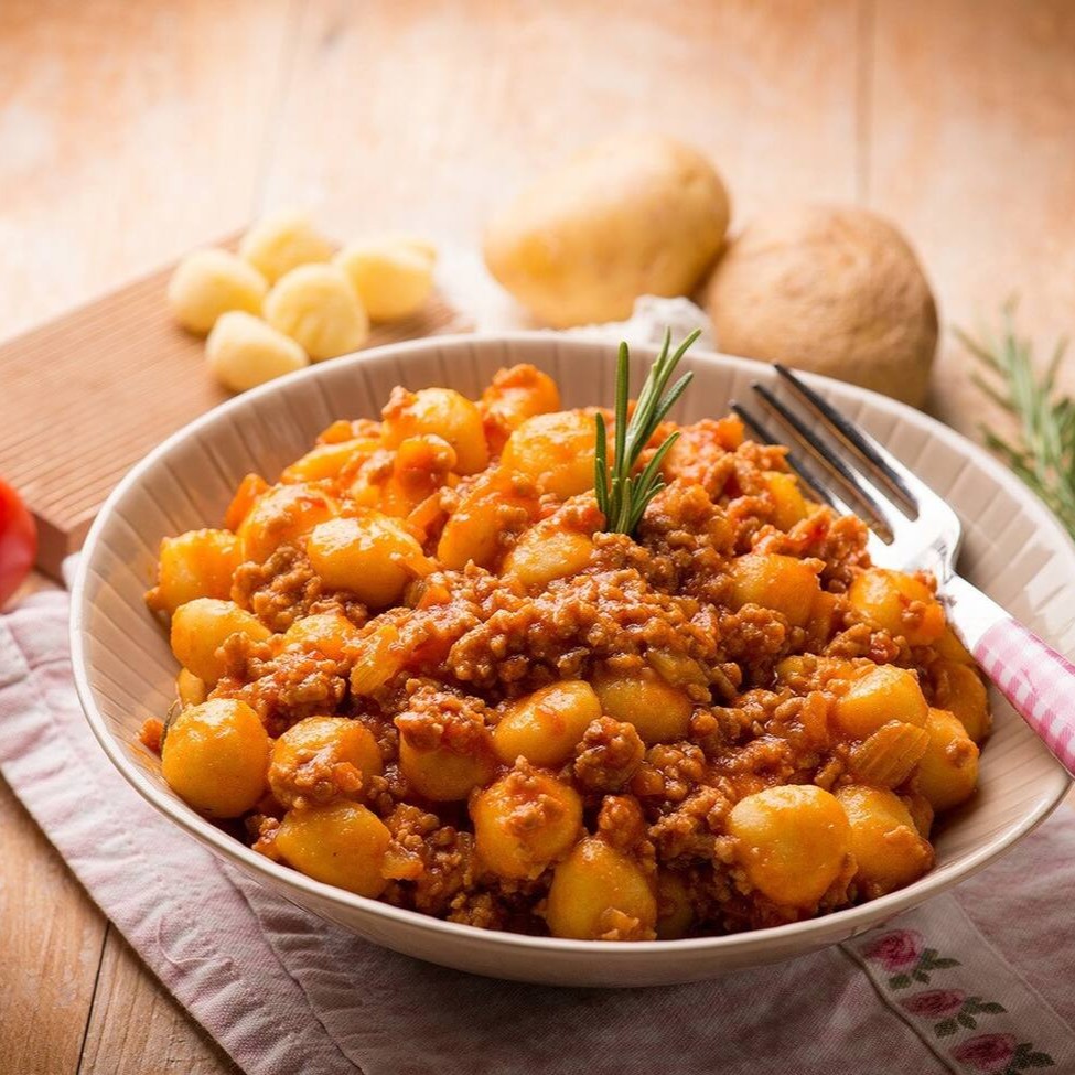 Gnocchi de batata temperado com nosso famoso molho ao ragú de carne, cozido lentamente por 6 horas. Finalizado com queijo parmesão importado. Pode escolher se pode ser feito com gnocchi de batata doce ou inglesa.