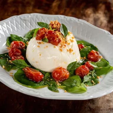 Deliciosa mozzarella aberta recheada com stracciatella (fios de mozzarella fresca marinadas na nata) servida com tomatinhos cerejas confitados no tomilho e pesto de manjericão.