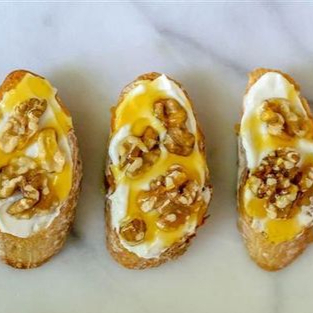 Torradas de ervas finas tostado servido com queijo brie, nozes chilenas e geleia de damasco.