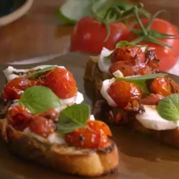 Torrada de pão, coberta com mozzarella de búfala, tomate confitados e pesto caseiro.