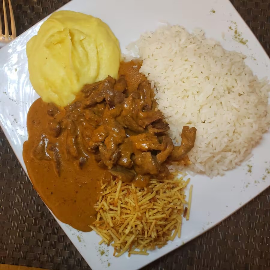 Apresentamos nosso Strogonoff de Filé Mignon, destaque na categoria 'Prato da Casa'. Uma receita primorosa, cuidadosamente preparada com suculentos pedaços de filé mignon, mergulhados em um molho cremoso e irresistível. Acompanha guarnições de um arroz branco soltinho, purê de batatas aveludado e uma generosa porção de batata palha crocante. Um prato que é, sem dúvidas, um convite ao prazer gastronômico e que promete uma experiência inesquecível.