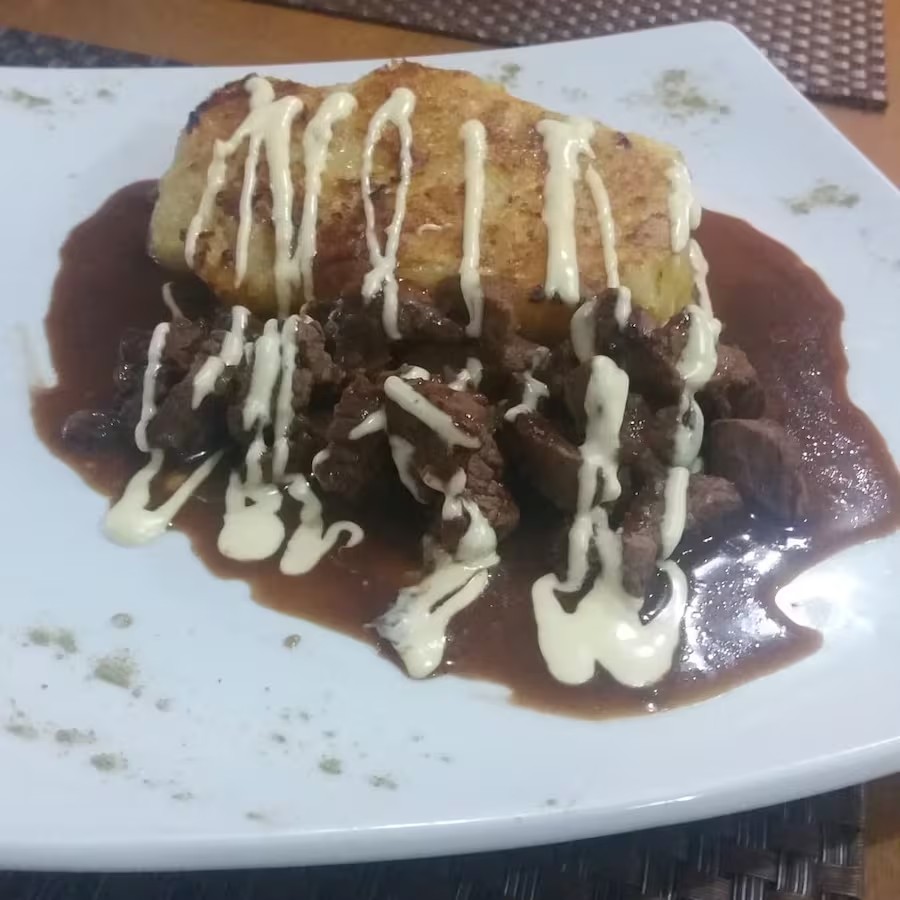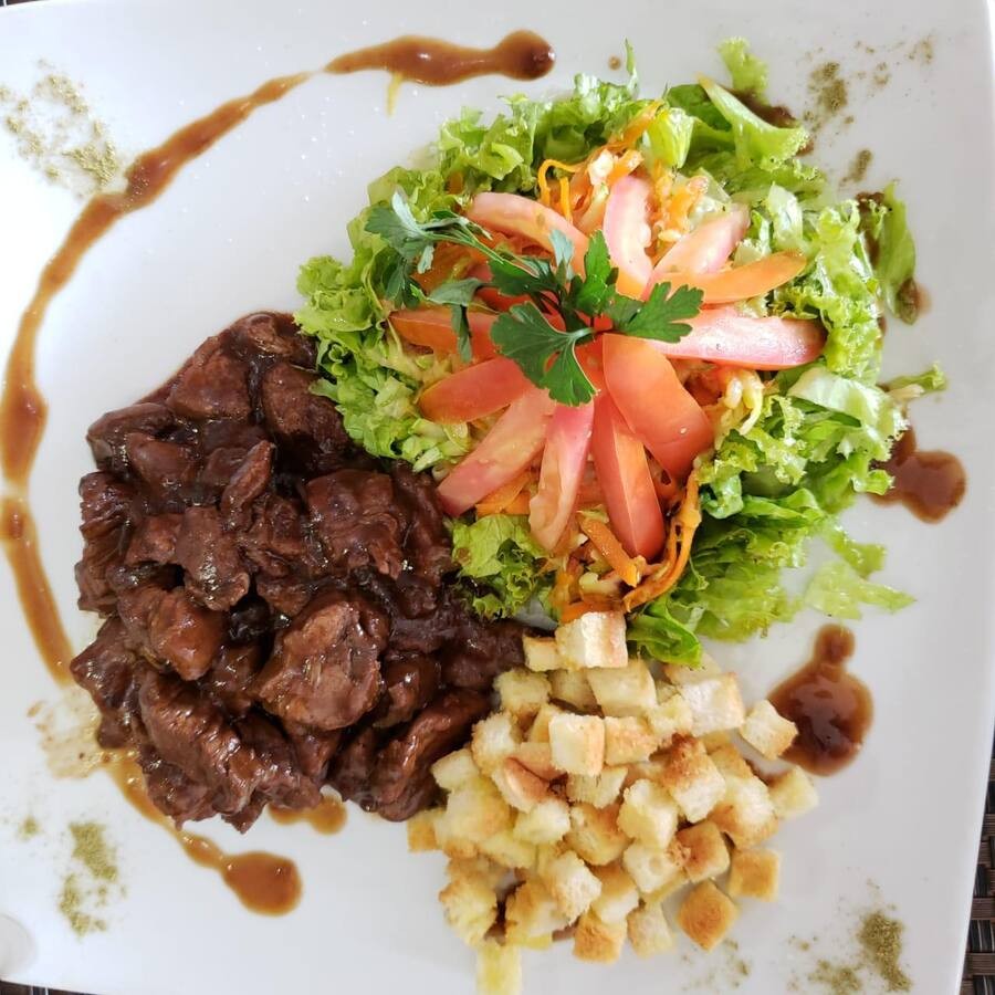 Delicie-se com a nossa 'Macaxeira Especial', uma combinação irresistível e saborosa. A macaxeira, cuidadosamente selecionada, é cozida até atingir a perfeição e, em seguida, é habilmente derretida na autêntica manteiga de garrafa, resultando em um sabor rico e inconfundível. Acompanha um suculento filé mignon, preparado na chapa para realçar toda a sua suculência e sabor, e é generosamente coberto com um molho aioli cremoso e apetitoso, que acrescenta um toque adicional de requinte a este prato. Uma experiência gastronômica única que promete satisfazer até os paladares mais exigentes.