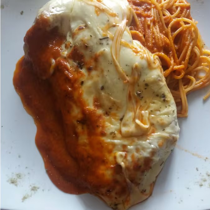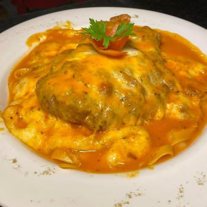 Delicioso Frango Parmegiana, individual ou executivo, preparado com maestria. O frango, cuidadosamente empanado com Panko, apresenta uma crocância incomparável, coberto com uma generosa camada de queijo gratinado que derrete na boca. Acompanha um autêntico espaguete italiano, servido ao molho de tomate pelado, cheio de sabor. Esse prato é uma verdadeira homenagem à tradicional culinária italiana, ideal para quem aprecia uma boa massa e sabores intensos e marcantes.