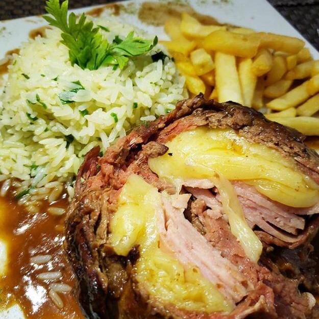 Filé suculento e tenro, meticulosamente recheado com um saboroso queijo que derrete ao primeiro corte e presunto de alta qualidade, tudo assado à perfeição em nosso churrasco especial. Coberto com um riquíssimo e brilhante demi glacê que realça todos os sabores. Acompanha uma guarnição de arroz de alho-poró, preparado de forma delicada e aromática, e batatas fritas crocantes por fora e macias por dentro, douradas à perfeição. Experimente nosso 'Prato da Casa' e eleve sua experiência gastronômica!