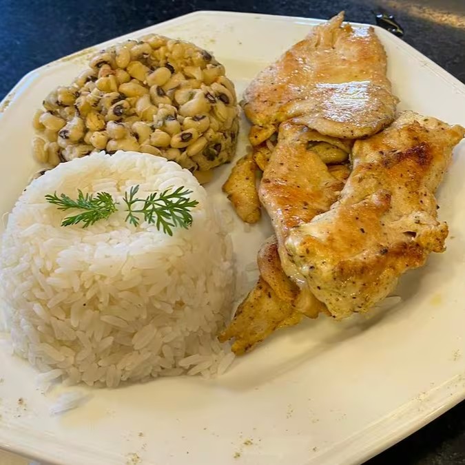 Delicioso Frango Grelhado Feijão Macassar, um prato da nossa casa que é um verdadeiro deleite para os amantes da boa culinária. O frango, perfeitamente grelhado no churrasco, apresenta uma suculência irresistível e um sabor inigualável. Acompanha, ainda, a tradicional guarnição de feijão Macassar, que com sua textura única e sabor marcante, complementa perfeitamente a refeição. O arroz bem temperado e o vinagrete fresco e crocante adicionam notas de sabor que tornam este prato uma experiência gastronômica completa. Descubra o prazer de saborear esse prato incrível que é uma especialidade da nossa casa!