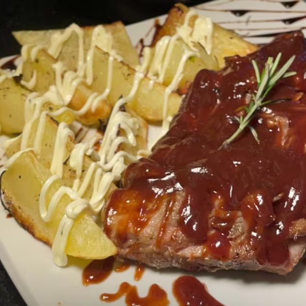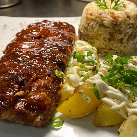 Apresentamos a nossa especialidade, o 'Baby Rib's Prime' com 400grs. Esta é uma costela suína primorosamente macia e irresistivelmente suculenta, temperada com um seleto mix de especiarias escolhidas pessoalmente pelo nosso chef. A costela é cuidadosamente coberta com o nosso famoso molho barbecue, que acrescenta um toque de doçura e um sabor defumado ao prato. O acompanhamento é uma porção generosa de batatas rústicas crocantes, repousando sobre uma cama de aioli cremoso e rico em sabor. Para completar, servimos um arroz de carne de panela, feito no capricho, que agrega ainda mais sabor a esta experiência culinária. Um prato de nossa casa que é uma verdadeira celebração de sabor!