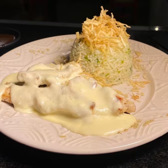 Saboroso peito de frango, cuidadosamente grelhado até atingir o ponto perfeito de suculência, generosamente coberto com uma mistura de queijos derretidos, criando uma camada irresistível e aconchegante. Este prato é ainda realçado pelo sofisticado molho demi-glace, que agrega um toque de requinte e uma explosão de sabor. Acompanha um delicado arroz de alho-poró, leve e aromático, que harmoniza perfeitamente com a intensidade dos demais ingredientes. Para completar, a crocância da batata palha, adicionando textura e um sabor inconfundível. Um verdadeiro deleite para os amantes de um bom prato principal, digno de ser a estrela do cardápio da casa.