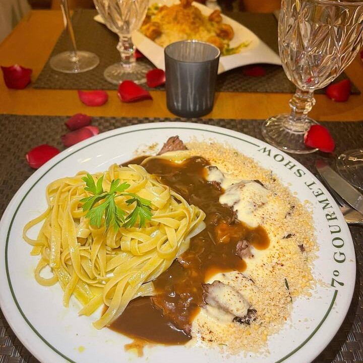 Desfrute de uma autêntica massa italiana, habilidosamente puxada com uma combinação divina de quatro queijos distintos. Acompanha generosos medalhões de filé mignon, uma carne extremamente suculenta e saborosa, finalizados com o nosso molho demi-glace de qualidade superior. Este requintado prato de massa promete uma experiência culinária memorável, agradando ao paladar mais exigente.