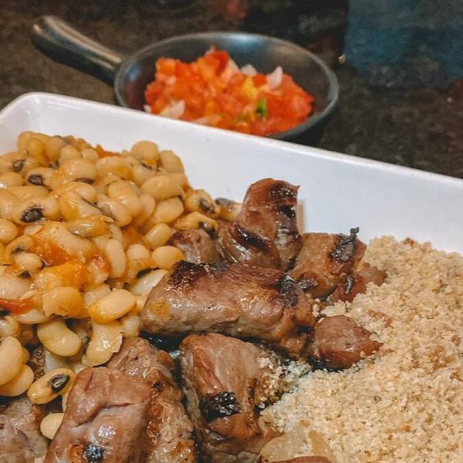 Nosso 'Arrumadinho de Carne de Sol com Vinagrete', uma especialidade da casa, é uma deliciosa refeição executiva. A carne de sol, cuidadosamente selecionada, é flambada na autêntica manteiga de garrafa, adquirindo um sabor único e intenso. Acompanhando, temos a cebola dourada, que agrega um toque adocicado ao prato, e o feijão macassar, conferindo um sabor robusto e terroso. A farofa crocante e o vinagrete fresco e picante equilibram perfeitamente os sabores. Este prato é um verdadeiro deleite para o paladar, uma explosão de sabores que representam a essência da nossa culinária.