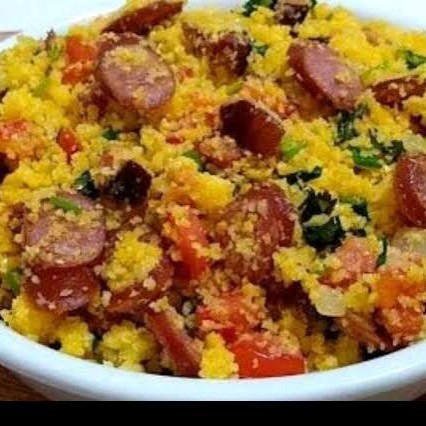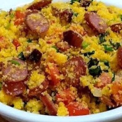 Nosso cuscuz, vai com carne moída, tomate, cebola, e uma generosa camada de queijo cremoso por cima