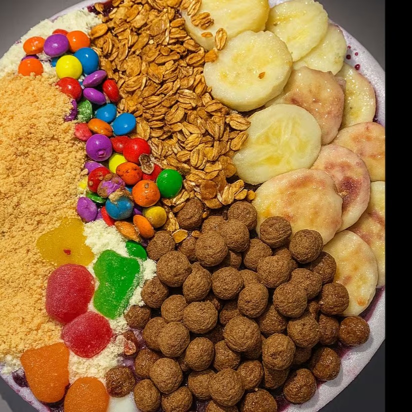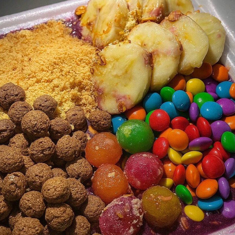 açai, banana,granola,chocoball,farinha de amedoim, disquete, jujuba