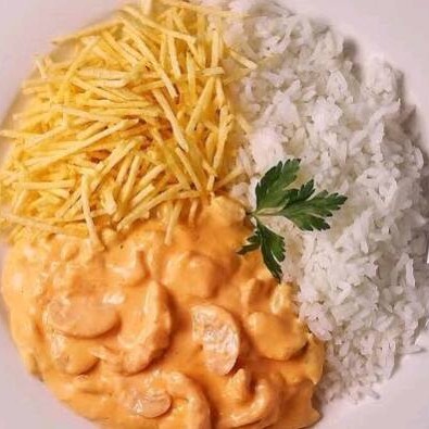 Delicioso strogonoff de frango preparado com cubos suculentos, creme de leite, molho de tomate especial da casa e um toque leve de temperos. Acompanha arroz branco soltinho e batata Frita. Porção ideal para uma refeição saborosa e completa!