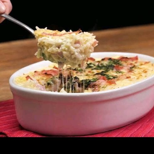 Uma receita caseira que conquista! Arroz cremoso ao forno feito com nosso creme especial da casa, presunto picadinho, queijo mussarela derretendo, cenoura ralada, requeijão cremoso, ovos cozidos e salsicha em rodelas. Uma mistura de sabores que aquece o coração e mata a fome com gosto de comida feita com carinho!
