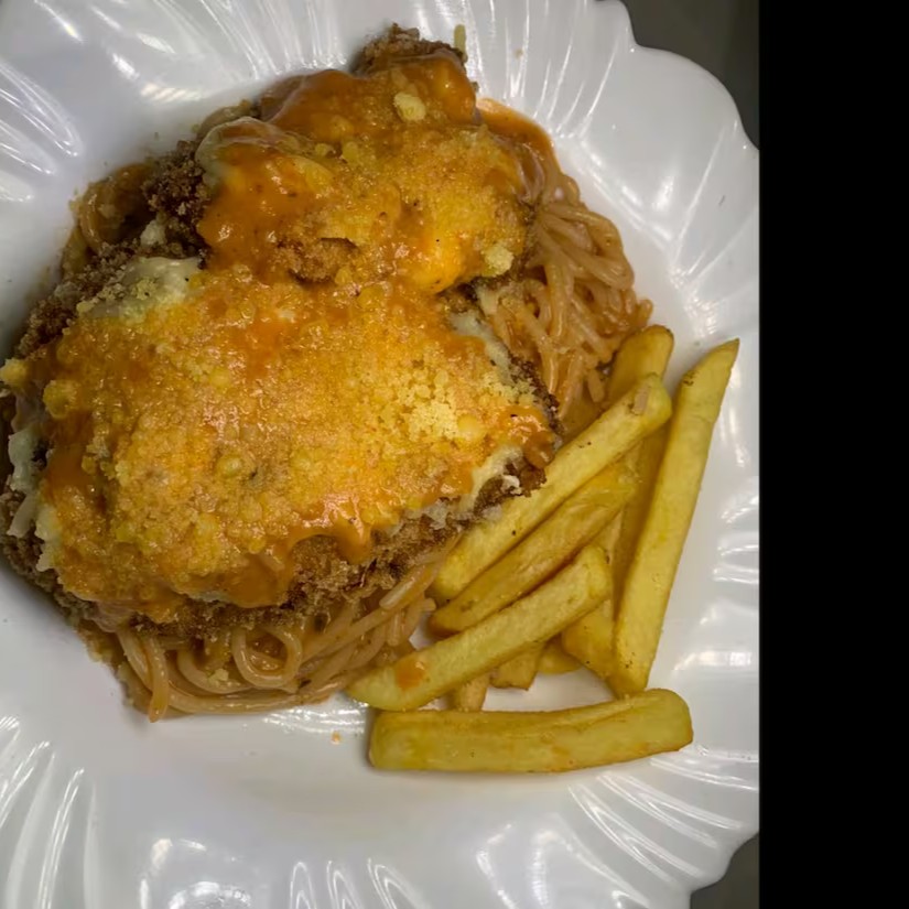 Um clássico irresistível! Filé de frango empanado, frito até ficar dourado e crocante, coberto com molho de tomate caseiro e uma generosa camada de queijo derretido gratinado. Acompanha uma porção de batatas fritas crocantes por fora e macias por dentro. Uma refeição completa, saborosa e feita na medida certa para matar a fome com muito sabor.