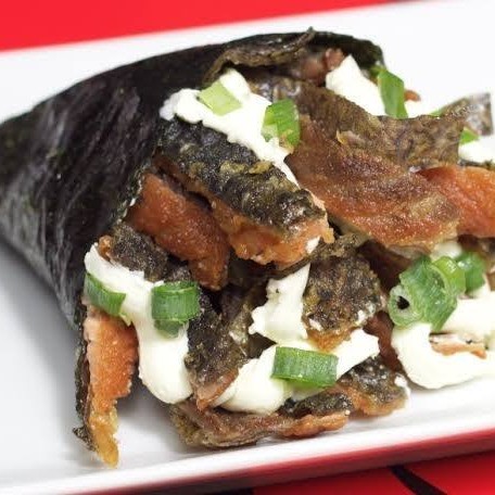 Temaki salmão frito com cream cheese, cebolinho e gergelim.