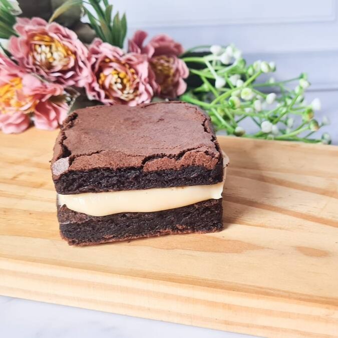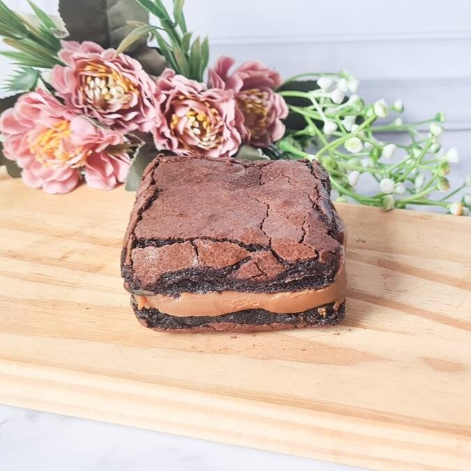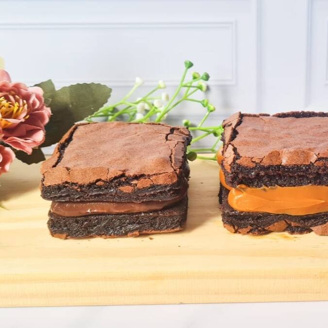 Leve 2 sanduiches de brownie mega recheado com 10% de desconto, brownie bem molhadinho por dentro e casquinha por fora, com recheio brigadeiro de chocolate cremoso e doce de leite. ________tags________