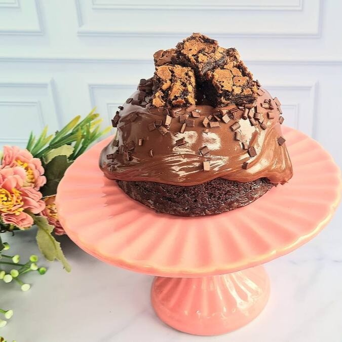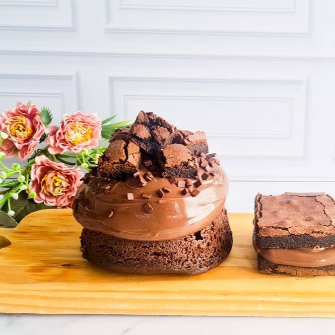 Bolo de chocolate, bem chocolatudo, recheado no centro com brigadeiro e brownie. Também finalizado com uma cobertura de brigadeiro cremoso quentinho e com pedaços de brownie.