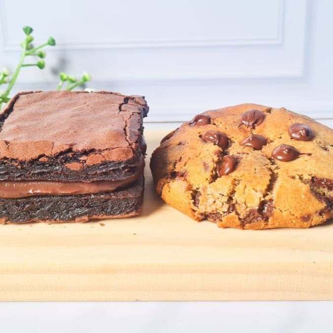 Com essa dupla de oferta você vai levar de uma vez só a combinação mais pedida da loja. Cookie tradicional com gotas de chocolate nobre ao finalizar e chega quentinho. Também vai levar o nosso sanduíche de brownie recheado do nosso brigadeiro cremoso artesanal. ________tags________