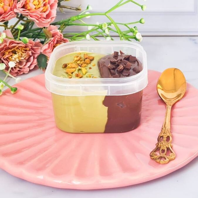 Duo de brigadeiros gourmet irresistível com brigadeiro artesanal de pistache e nosso maravilhoso brigadeiro blend super cremoso perfeito para saborear de colher.