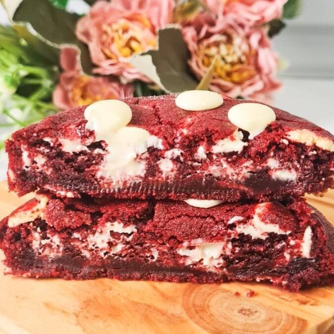 Uma Obra-prima da confeitaria que vai conquistar seu coração! Com uma massa vermelha e gotas de chocolate branco nobre, crocante por fora e macio e sucolento por dentro.Delicia-se com a harmonia perfeita de sabores e textura neste cookie único.