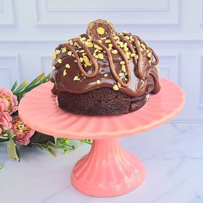 Trago uma releitura do bombom Ferrero Rocher, o bolo caseirinho é recheado no centro com Nutella pura e coberto de calda de brigadeiro blend. Finalizado com amendoim.