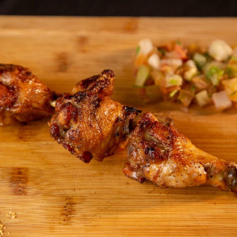 Três deliciosas coxinhas da asa no espeto e assadas na brasa.