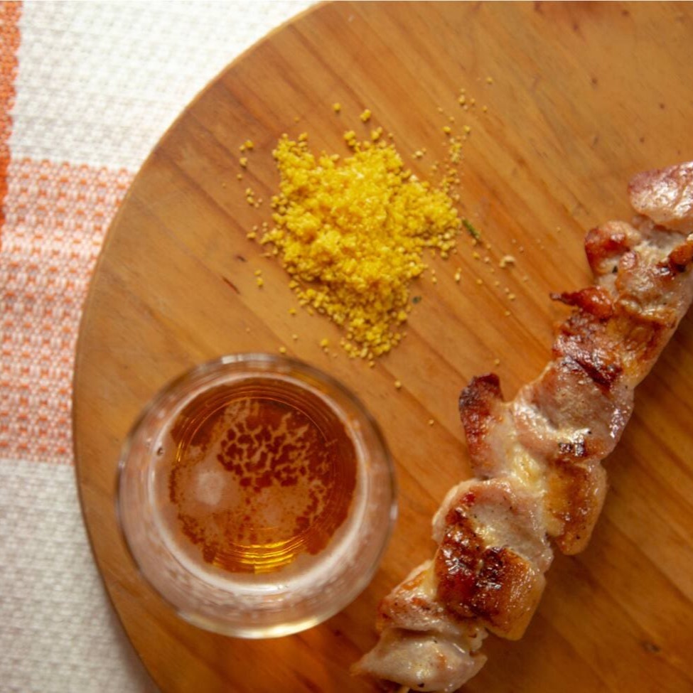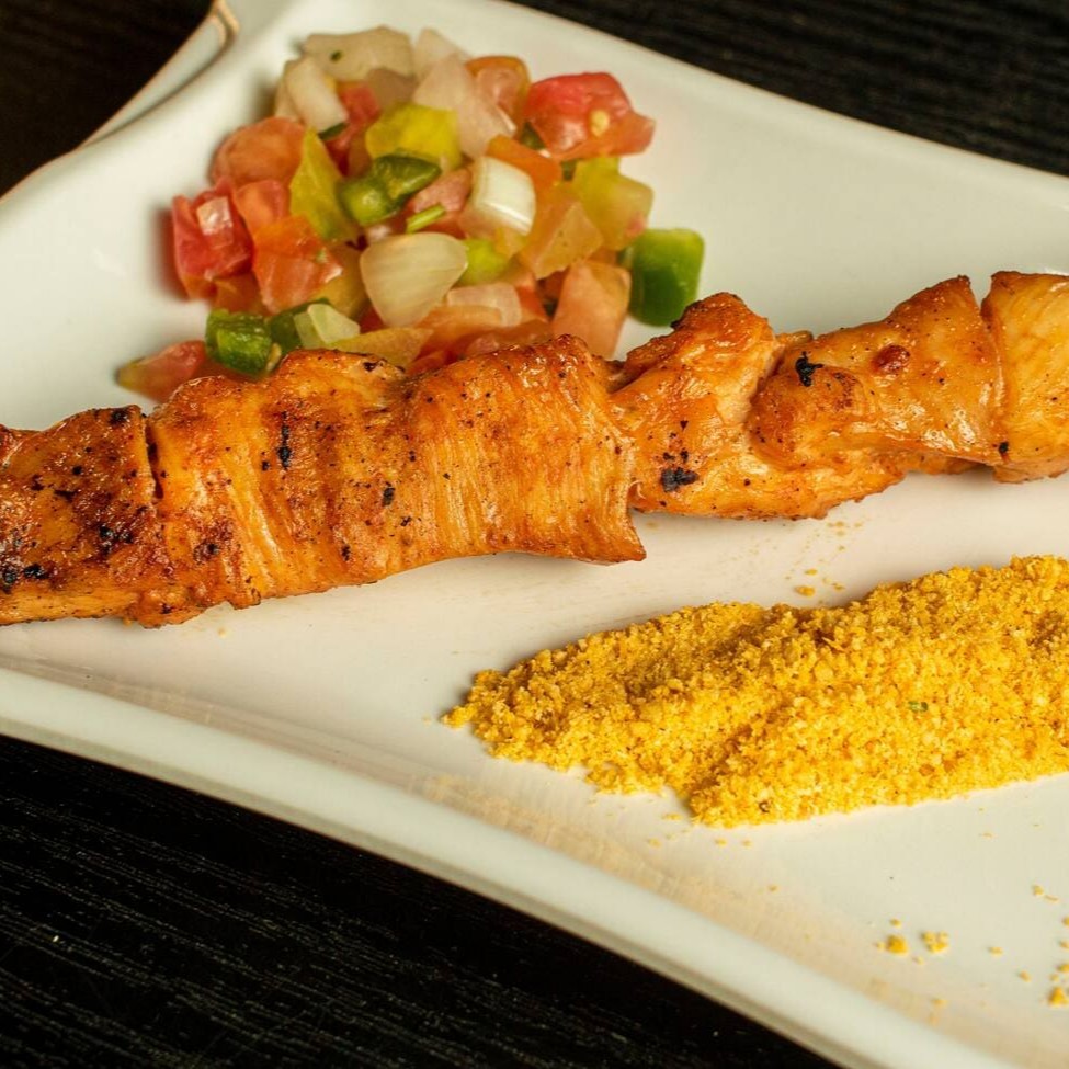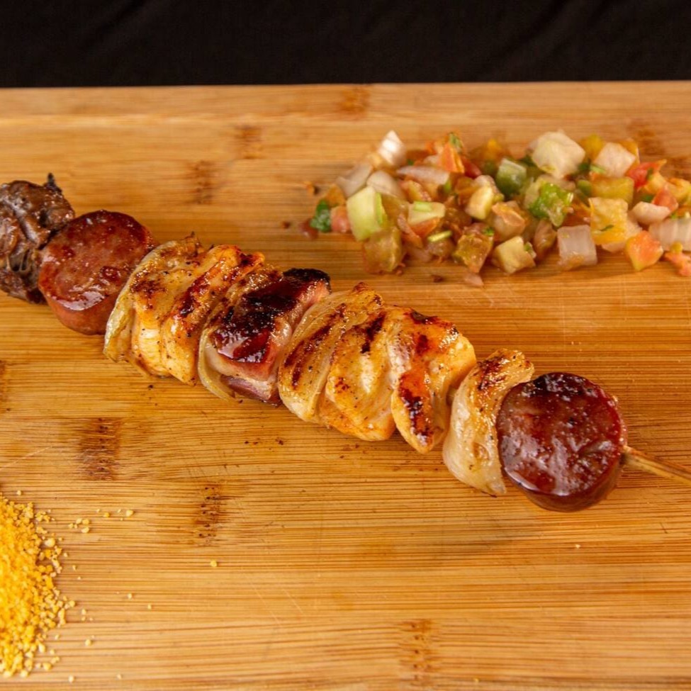 Suculentos pedaços de carne, frango, bacon, calabresa e cebola, no espeto.