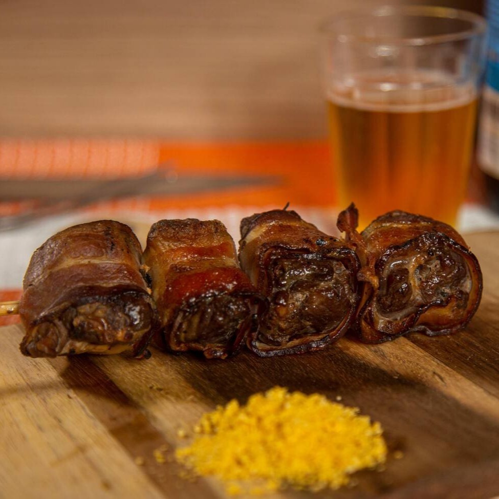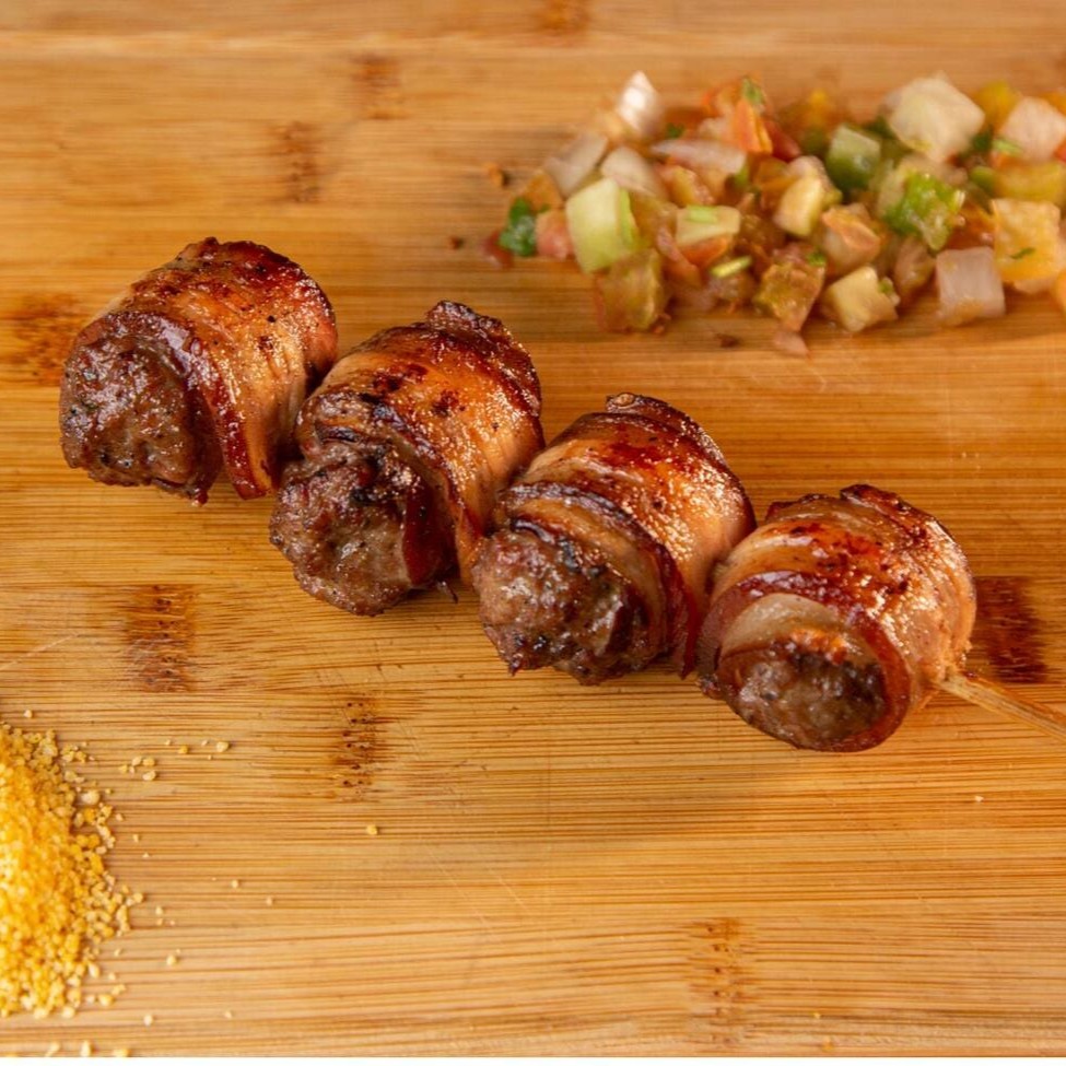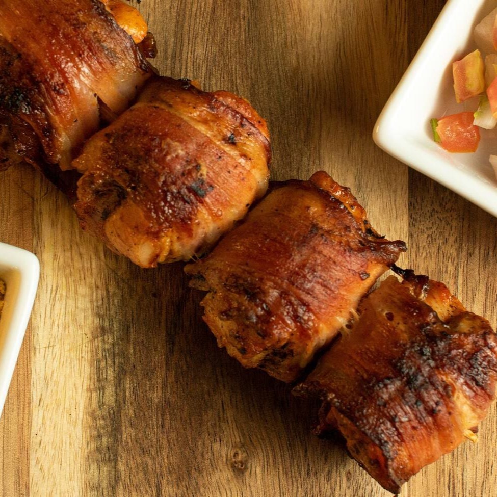 Pedaços suculentos de carne de primeira, envoltos com tiras de bacon e assado na brasa.