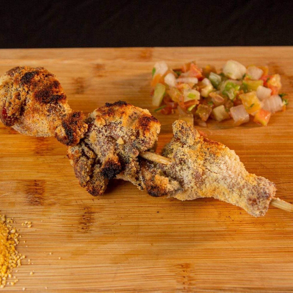 Coxinha de frango com um tempero especial, assadas na brasa e empanadas no queijo parmesão.