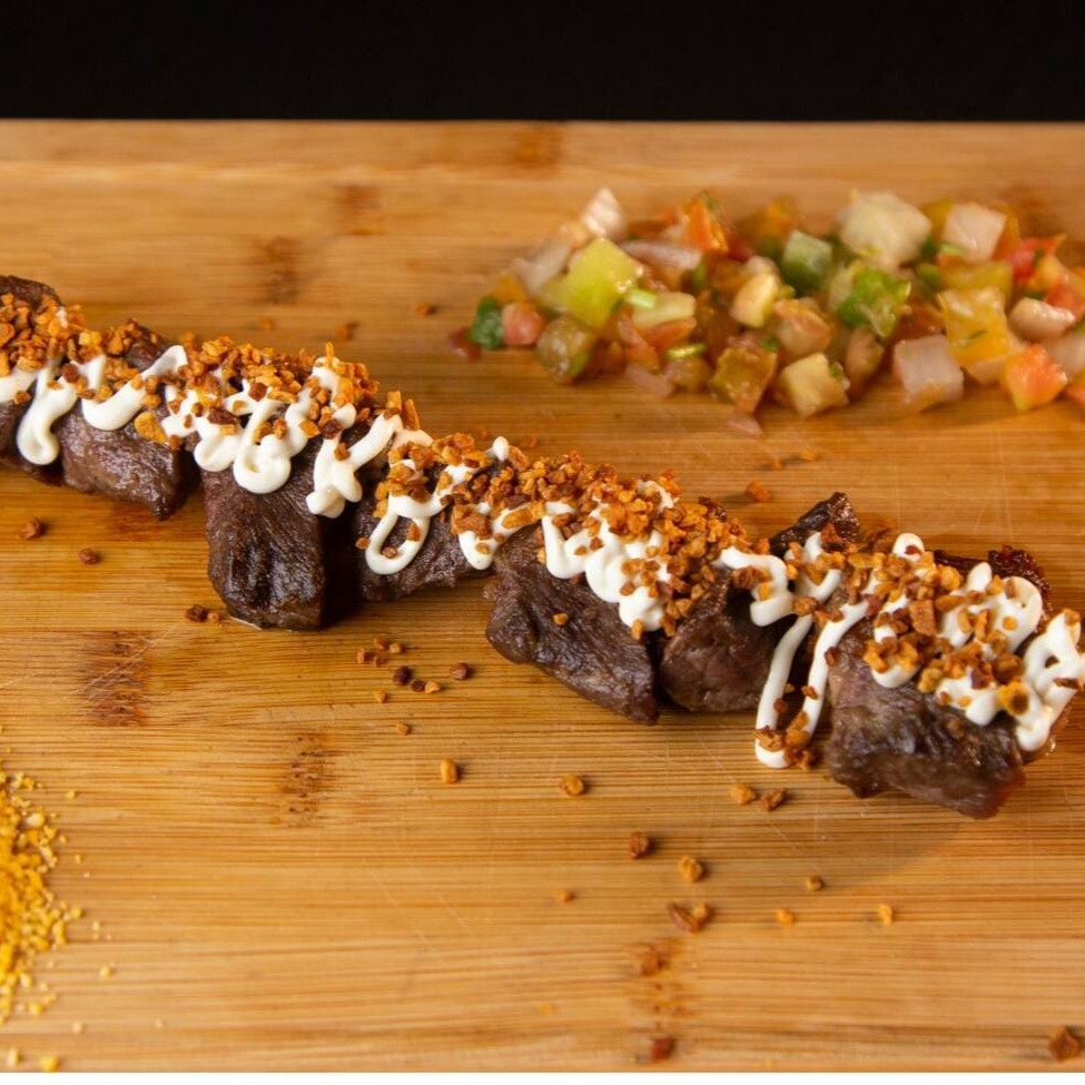 Cubos macios e suculentos de filé mignon, cobertos com cream cheese e finalizado alho torrado granulado.