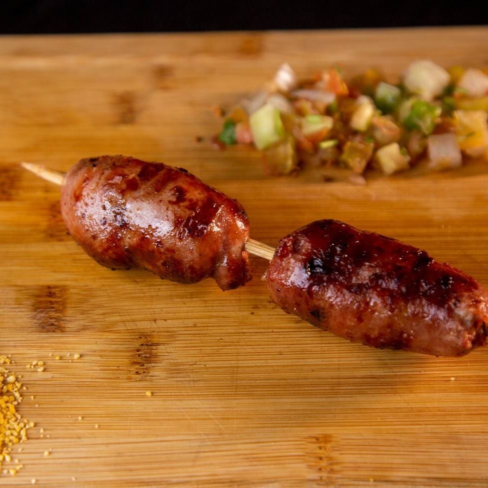 Espetinho com duas linguiças toscana suína, ao ponto. (aurora)
