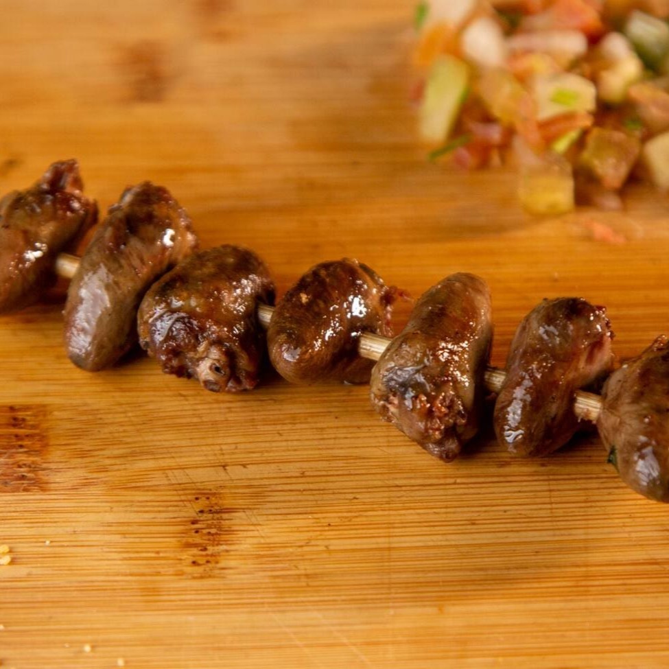 Espetinho de coraçãoes de frango, feito na brasa e bastante suculento.
