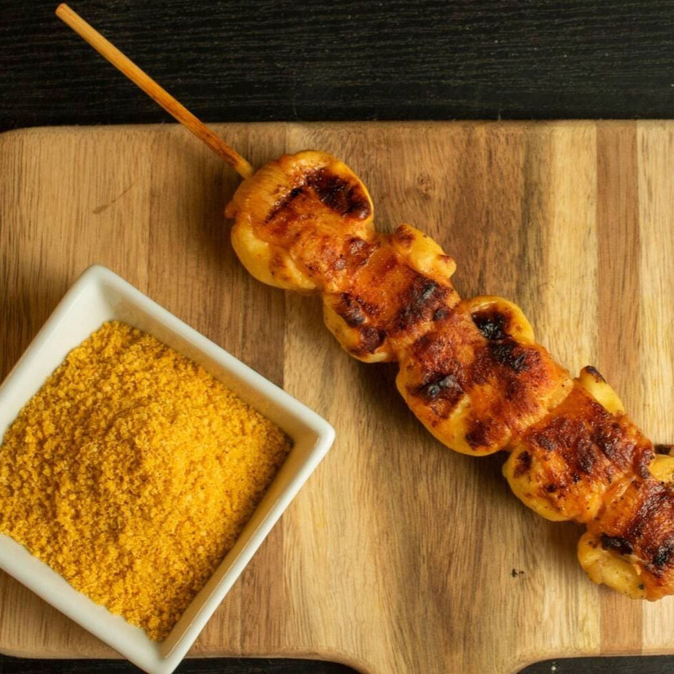 Cubos de Filé de peito de frango cobertos com queijo parmesão e finalizado na brasa.