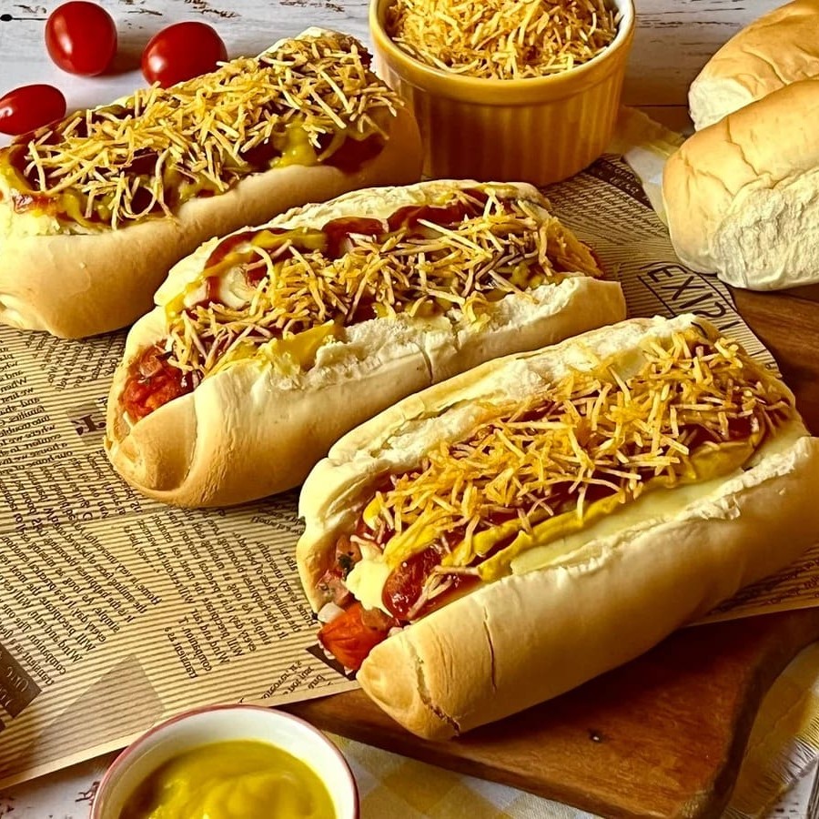 Pão, Salsicha, Molho, Vinagrete, Milho, Ervilha, Batata Palha, Queijo Ralado, Catchup, Maionese, Mostarda.