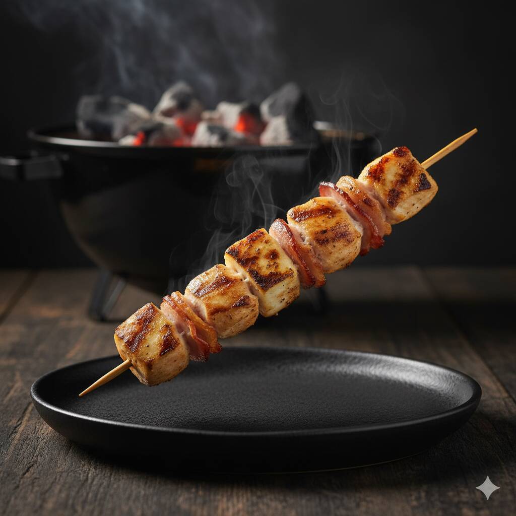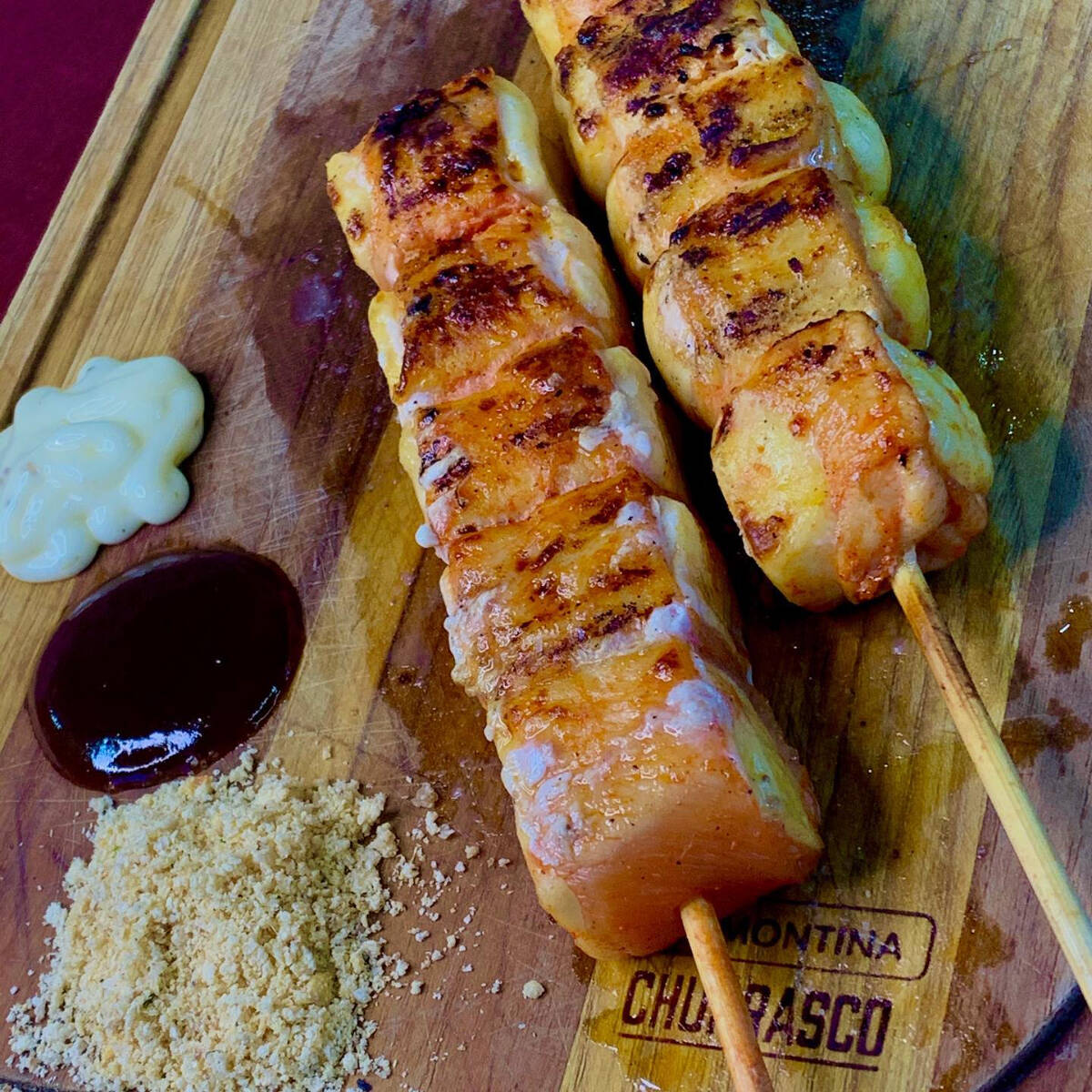 Frango suculenta assada na brasa, queijo derretendo e bacon crocante, formando um espeto completo, intenso e extremamente saboroso.