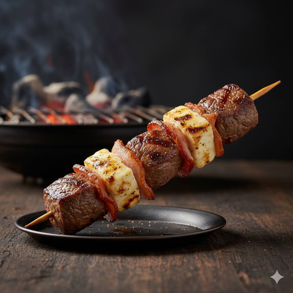 Carne suculenta assada na brasa, queijo derretendo e bacon crocante, formando um espeto completo, intenso e extremamente saboroso.