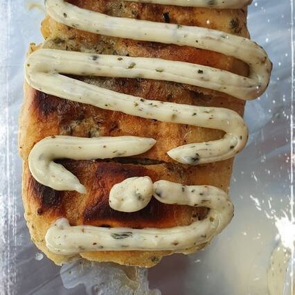 Esfiha tradicional com carne moída temperada e cebola picada, assada até dourar.