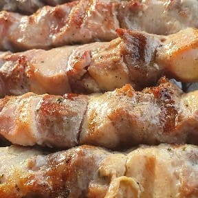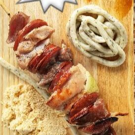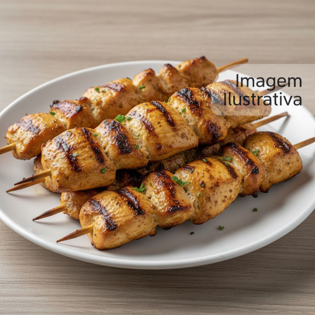 Deliciosos pedaços de frango marinados e grelhados no espeto, temperados com ervas e especiarias.