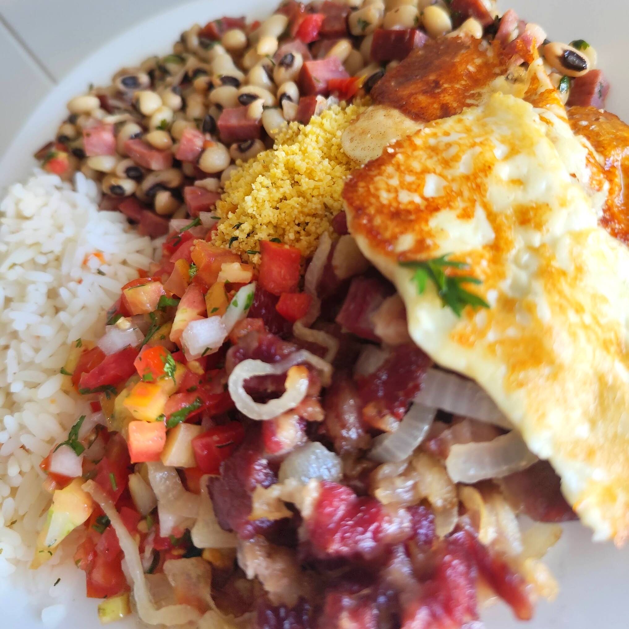 Feijão tropeiro, arroz, vinagrete, farofa e queijo coalho.