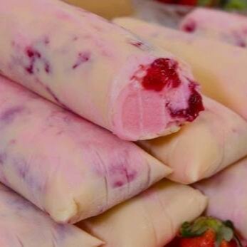 Base de sacolé gourmet com 4 leites, recheio: Morango com casca de chocolate branco.