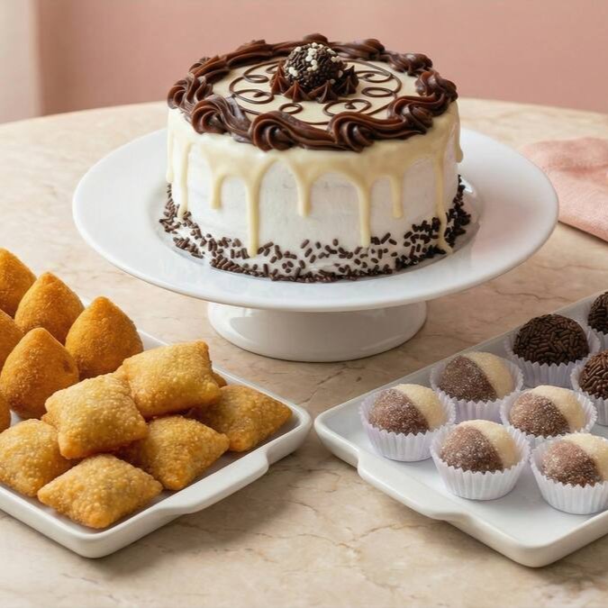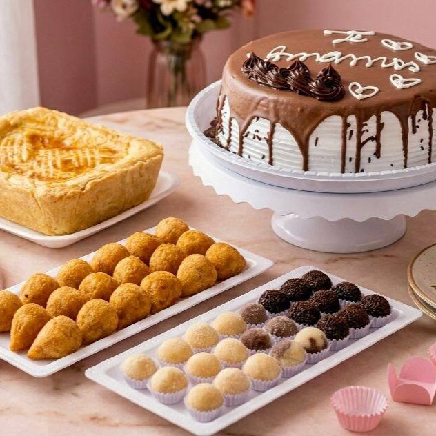 Aproveite nosso Mini Kit Festa Combo completo para pequenas comemorações.Contém:️ 1 mini torta (bem-casado ou chocolate)️ 5 brigadeiros️ 5 beijinhos️ 10 coxinhas️ 10 risoles de carneIdeal para aniversário, lanche em família ou surpresa especial. Peça agora e receba um kit completo, saboroso e pronto para comemorar. serve 2 a 3 pessoas