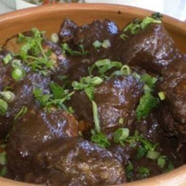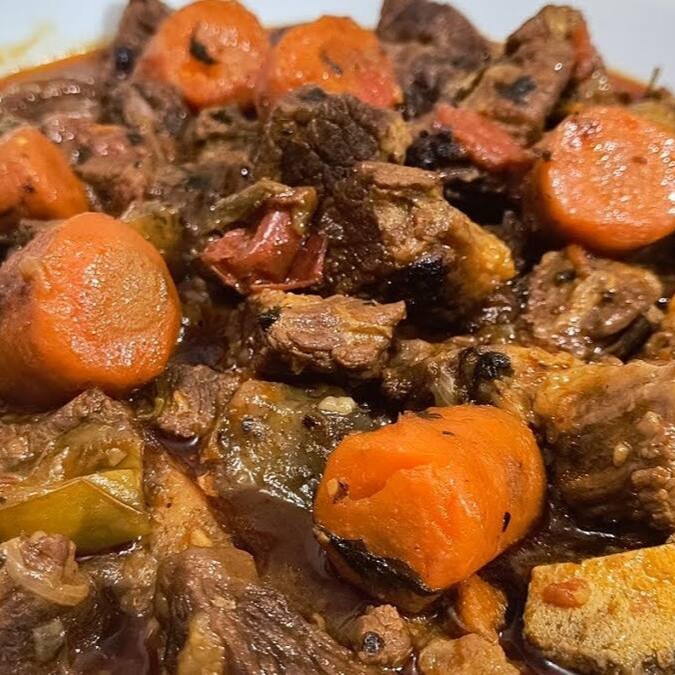 Guisado de boi bem temperado e suculento, acompanhado de feijão, arroz, macarrão, salada do Dia, suco e sobremesa de cortesia.