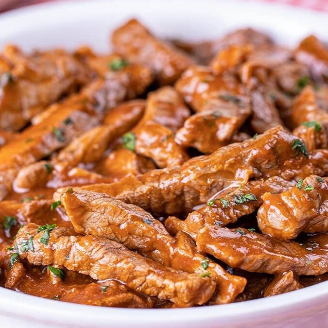 Isca de carne ao molho madeira, macia e saborosa, servida com feijão, arroz, macarrão, salada do Dia, acompanha suco e sobremesa de cortesia.