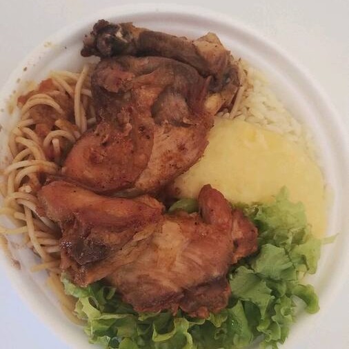 Maravilhosa sobrecoxa assada refinada. Acompanhamentos: feijão preto, feijão mulato (a escolha), arroz, macarrão, purê de batata, cenoura ralada, salada de alface, tomate, cebola e pepino.