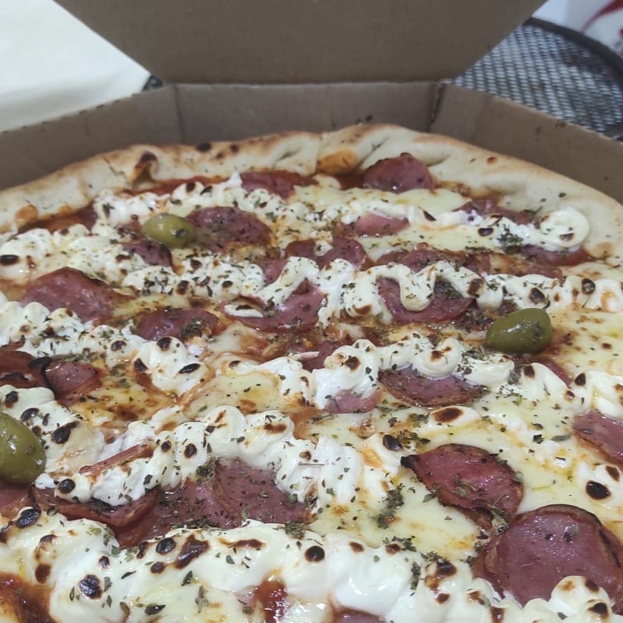 Molho de pizza, muçarela, Calabresa, Catupiry, orégano e azeitona