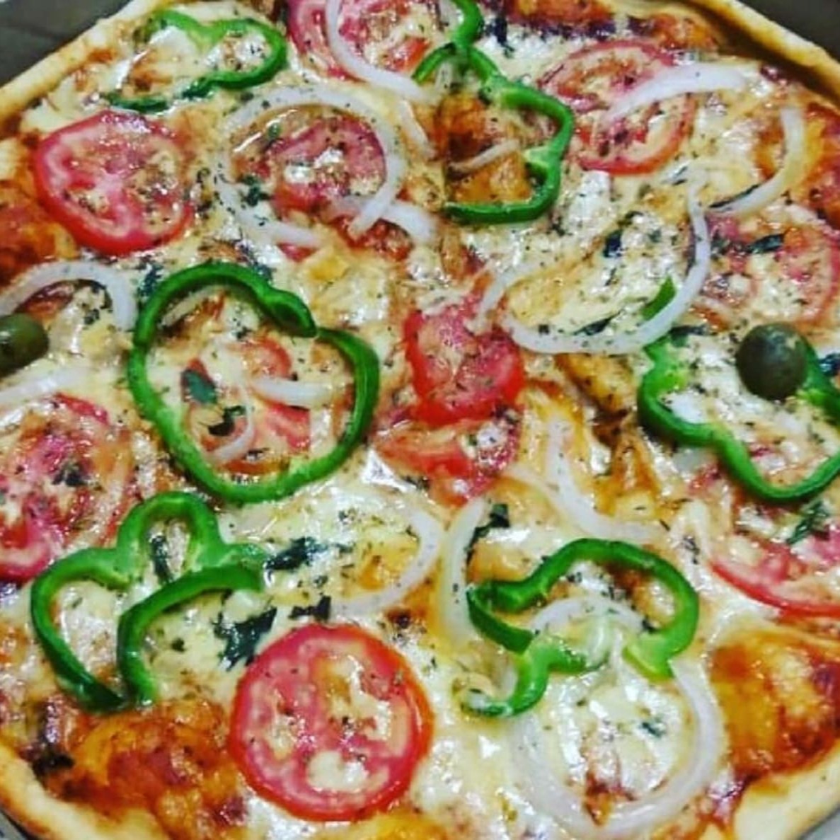 Molho de pizza, mussarela, cebola, tomate, pimentão, orégano e azeitonas