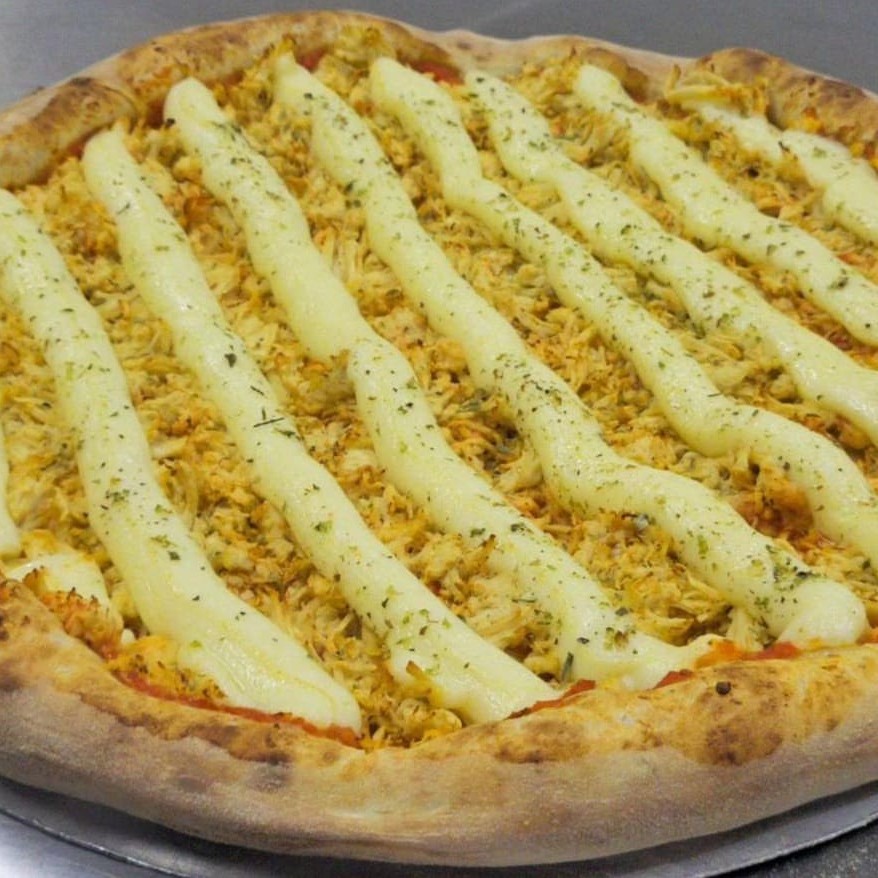 Molho de pizza, frango, mussarela, frango, crean chesse e oregano e azeitonas