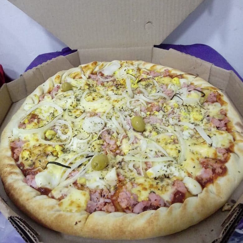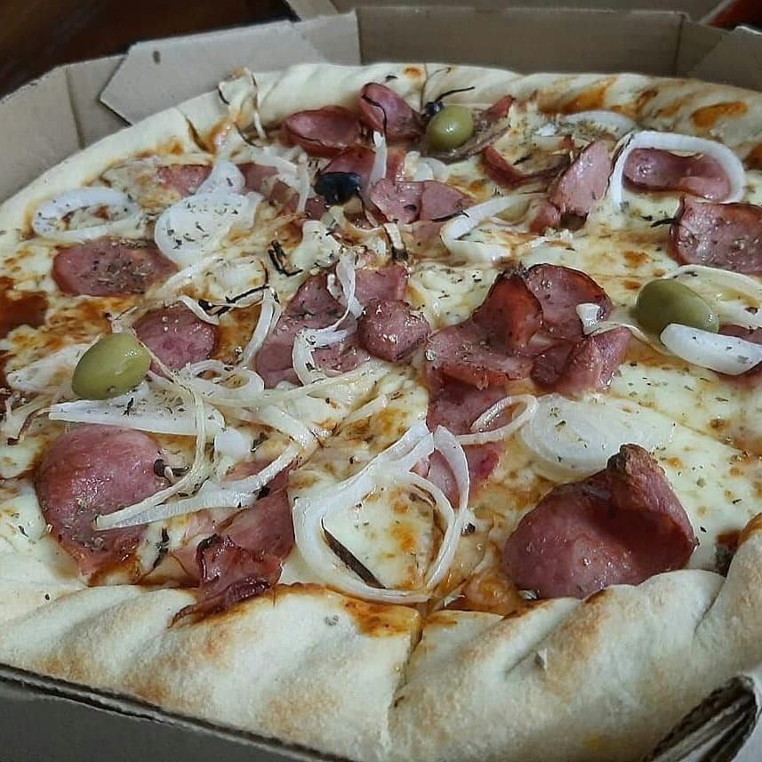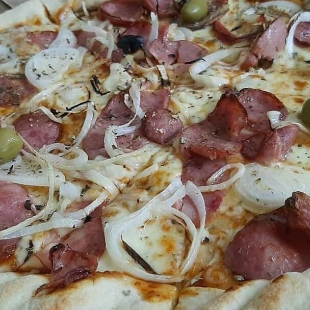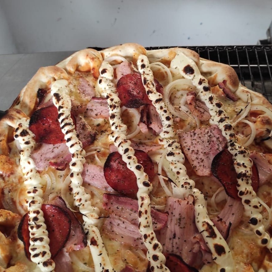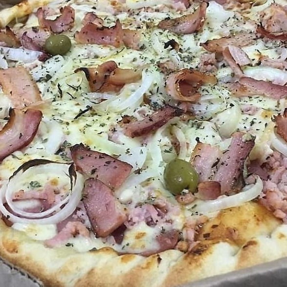 Molho,presunto,mussarela, calabresa, bacon, cebola,oregano e azeitonas