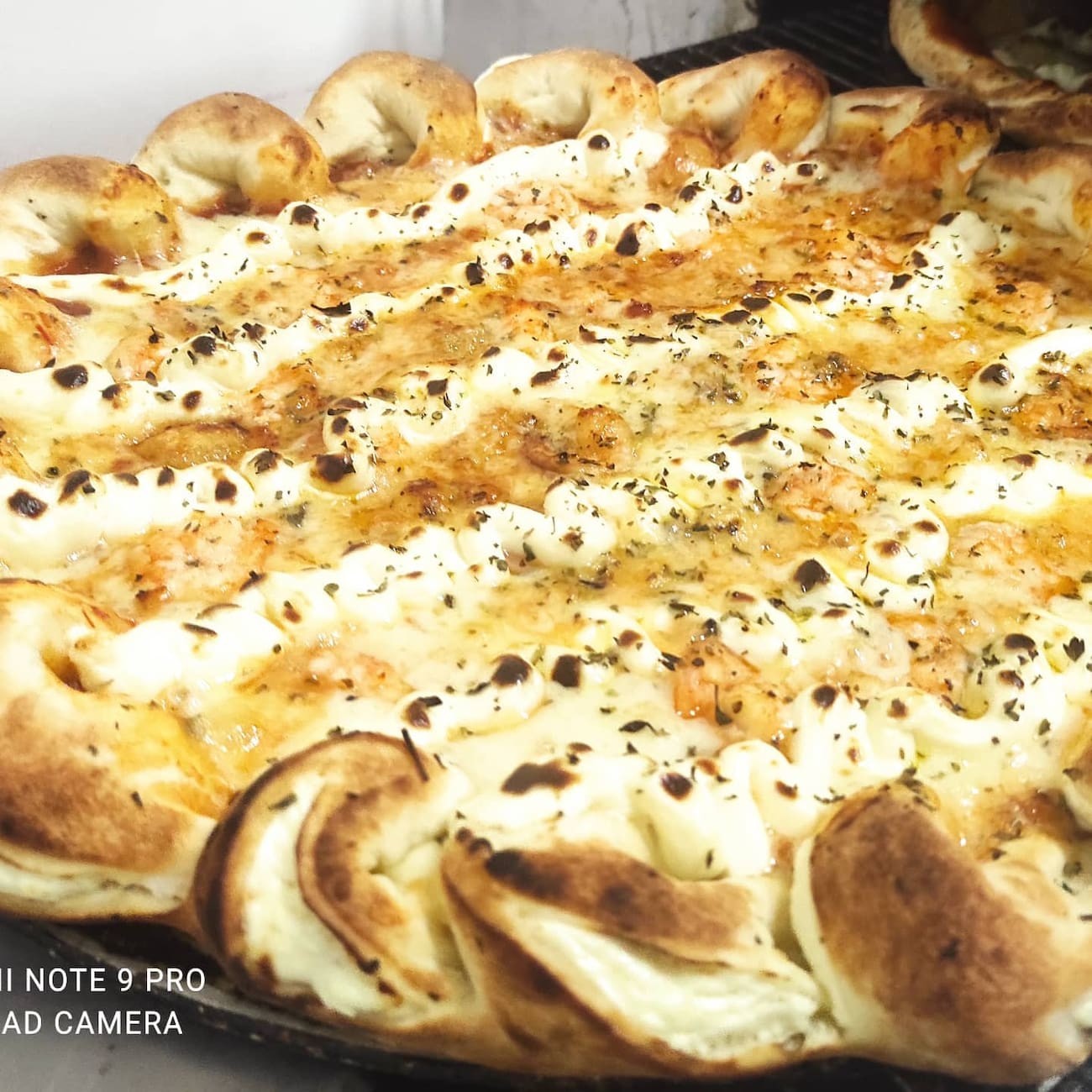 Molho,mussarela,Camarão,Cream Cheese, Alho frito.